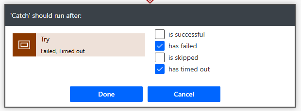 - Check "has failed" and "has timed out". This means the Catch Scope will only run if the previous Try Scope has failed or timed out.