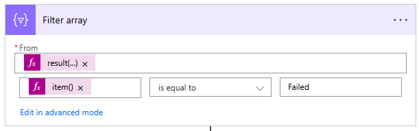 - Set the row expression to item()?['Status'] is equal to Failed.