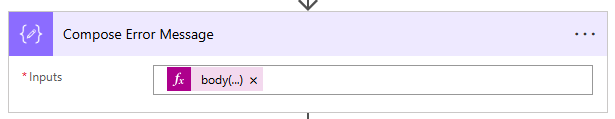 - Add a Compose action to capture the error message. Rename it to Compose Error Message and set the Input to the following expression: