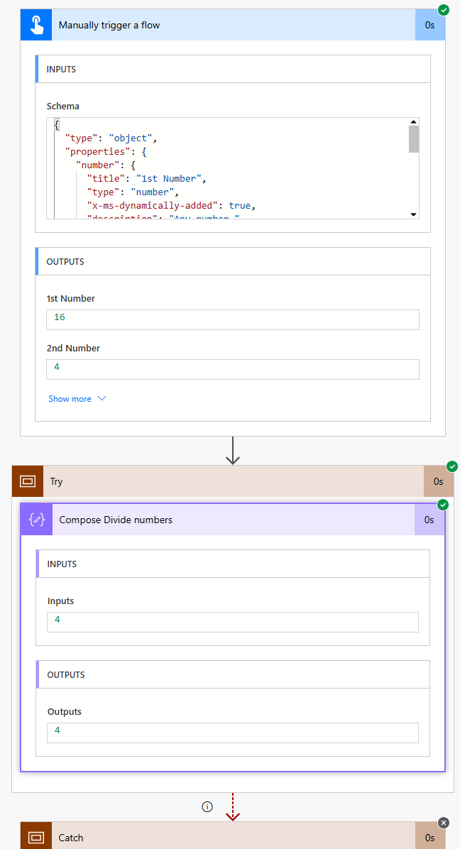 If you run your workflow and add two valid numbers, such as 16 and 4, it should run successfully with no errors. Notice that the Catch scope does not execute.