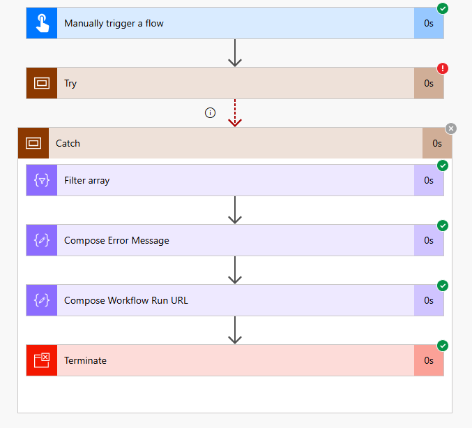 - Finally, it can be confusing if the workflow has errors but finishes successfully. By adding this Catch logic, we're catching the error, and technically, the workflow no longer fails. So, we can add a Terminate action here so that it shows as failed in the run history.