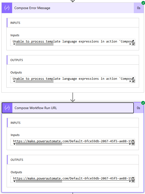 If you expand your two Compose actions, you should see the error message and the Workflow Run URL.